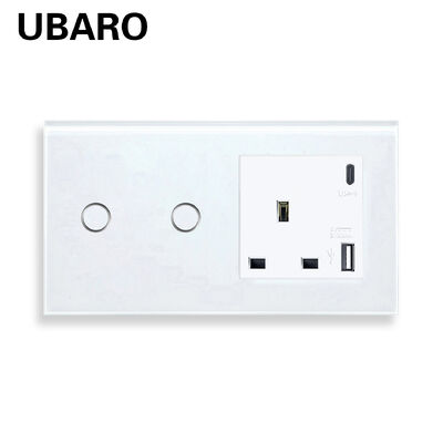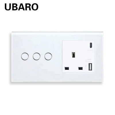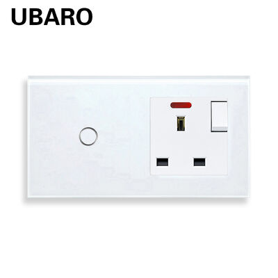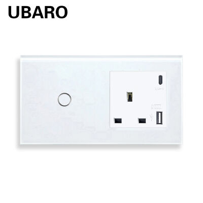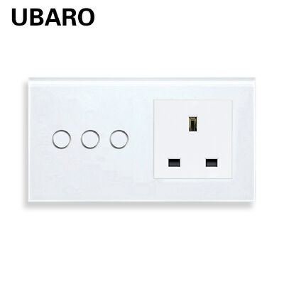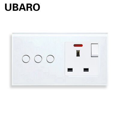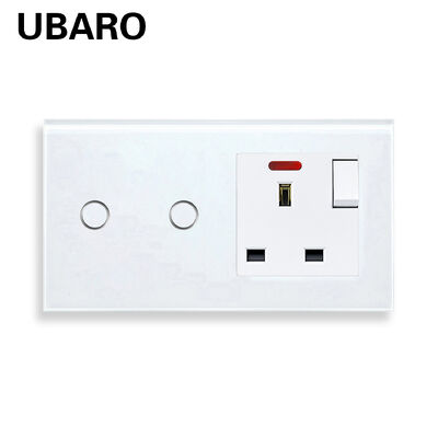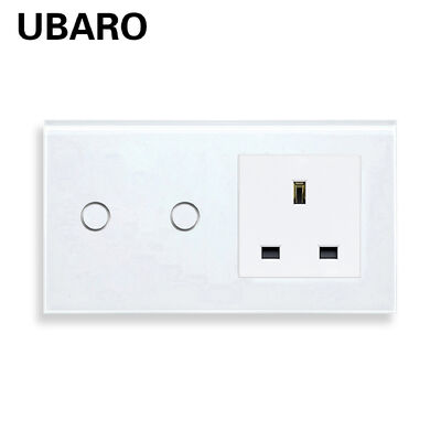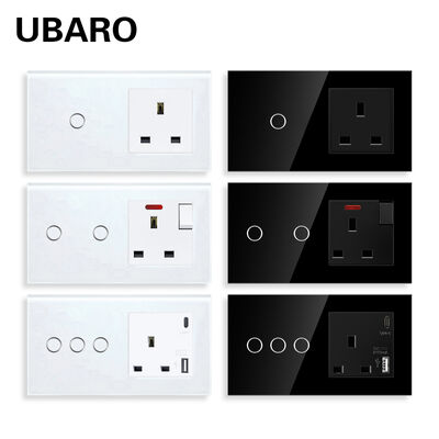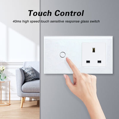 Premium 146*86*35mm glass panel touch switch and socket combination featuring fireproof 94V0 plastic construction. Designed for residential use in UK, Middle East, and African markets.