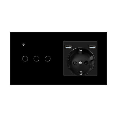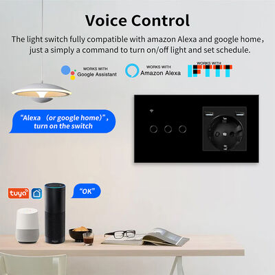 This innovative Smart Switch and Socket combines electrical switching and power outlet functionality into a single, sophisticated unit. Featuring a sleek black glass panel, the device offers multiple control methods including voice, manual, and app-based operation for ultimate convenience in modern living and working spaces.